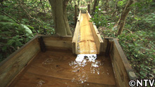 湧き出す源泉は木樋のゆるい傾斜を流れる間に、冷めて適温になる。