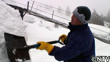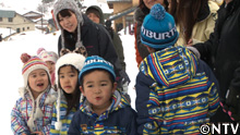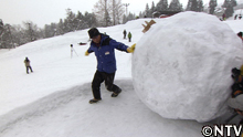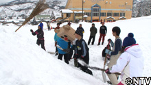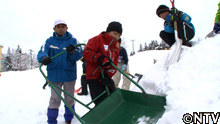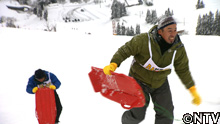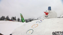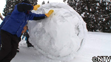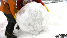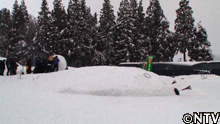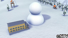 地元の子供達に協力してもらい、 ゲレンデのジャンプ台を雪だるまの胴体に加工。 一方山頂からは松岡と長瀬が、 雪だるまの顔となる雪玉を転がしながら大きくし ふもとまで降りてくることに。 |