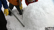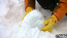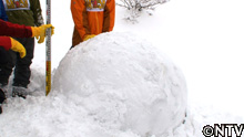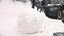 長瀬「ここから急こう配だから割れちゃうと思う」 雪玉作りのベテラン二人は、斜度22度になるこの急斜面で 雪玉を転がすのは危険と判断。 下から支えながら進めようにも、 この時点で直径90cm、重さはおよそ120kgにもなり、 二人では到底無理。 |