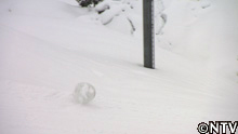 と、スレスレで看板は避けられた! しかし…!その直後ハラッスーは真っ二つに! 長瀬「ハラッスー!割れちゃったよ」 その原因は、コントロールできず看板の方へ転がり、 なんとか衝突を免れたが、 柔らかな雪がべったり付きいびつな形となり、バウンド。 自らの重さに耐えきれず割れてしまった…。 |