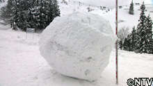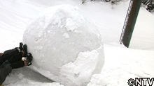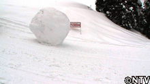 ここからは柔らかい雪が続く新雪エリア、 勢いがついても割れる心配はないと判断。 さらに、魚沼産の新雪がごっそりとくっつくはず。 長瀬「転がるの速い!速い」 順調に転がり続け、一気に30cmほど成長。 直径1m45cm、重さはホッキョクグマほどの雪玉に。 |