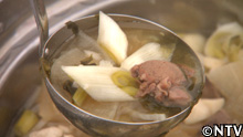 と、ここで、地元のお母さんたちが作ってくれた、 山ウサギの肉を使った伝統料理、魚沼名物「深雪汁」で栄養補給。 さらに、魚沼産コシヒカリのおにぎりもいただく。 |