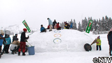 一方、土台作りは、町の方々の力で綺麗な半円に。 学校の先生方、さらにスキー場公認ゆるキャラ、スハラットの力も お借りして作業。 必死になるのは、子ども達、そして、自分の居場所を守る為。 |