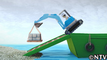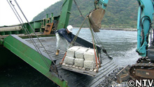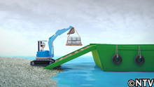 つまり、石材を一旦、スロープの途中に置き、先にクレーンを台船から降ろし、