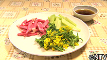 菜の花を添えたら、『春野菜の0円サラダ』のできあがり! |