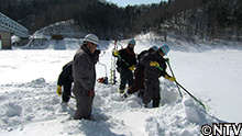 積もった雪を除雪していくと、その下からは湖に張った氷が出てくる。