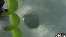まずは、ワカサギ釣り用のドリルで穴を空け、氷を切り出していく。