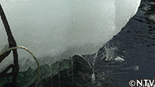 底の部分には、湖の水のみが凍った透明な氷が。 |