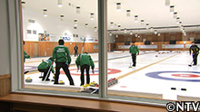 カーリングチームがコースを磨き氷の滑りをアシストする。 |