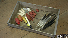 浜で集めた漂着物、ウキや羽、拾った竹で作っているのは“弓矢"。