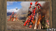 縁起物を燃やした炎は、上がるほどに願いが叶うとも言われる。 |