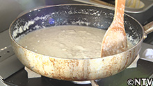 まずは、やまといもの切れ端をすりおろし、チーズと一緒にフライパンで加熱する。