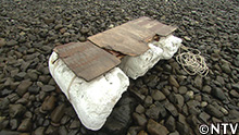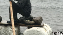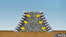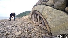 これに石を載せ、足場丸太の上を滑らせて海へと押し出す。