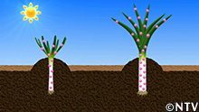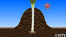 ネギは、生長すると、地面から出て陽に当たった部分が青くなる。