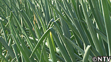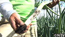 ネギの生長に合わせて土を被せ、日光に当てないように栽培している。 |
