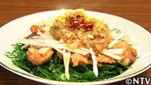 そして、緑の葉の部分の千切りを敷き詰めた上に揚がった鶏肉を並べ、