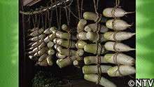 沢庵漬けを作る際、一本ずつ大根を縛って吊し、干すやり方。 |