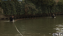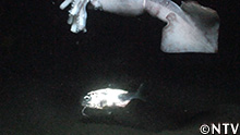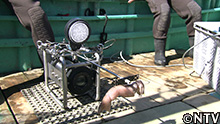 エサとなるイカを括り付けた、録画式の深海カメラを海へ投入し