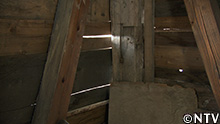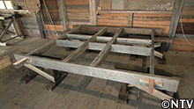 狭い舟屋、まず窓から1/3ほど出してから、梁の上に横から滑り込ませる。
