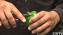 まず、親指で軸を折るように実をとり、ハサミで2度切り。