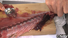 まずは長瀬、キメジのアラから身をこそぎ取り、