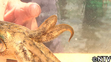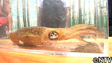 水槽に入れたアオリイカを刺激すると、色を変えて怒っているアピール!