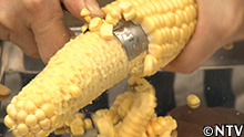 まずは、とうもろこしの粒を、専用のとうもろこしカッターでとる。