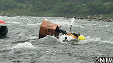 バランスを崩した2人は、舟もろとも激流の中に転覆! |