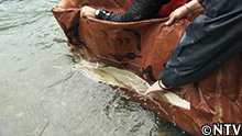 2人の体重130kgにも和紙の舟は耐えている。 |
