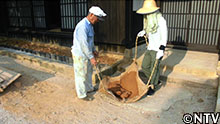 この日も水路作りは材料となる和製コンクリート三和土の準備から。