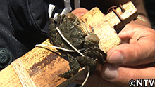 仕掛けに生きたカニの胴体をしっかり縛り付ける。