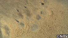 お寺の縁の下などを調査してみると、タヌキの足跡を発見。 |