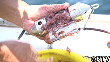 マグロの加工の際に出る切り粉(カス)を混ぜた餌を入れる。