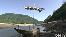 集落跡で見つけた布を使い、帆を立てて帆船に。