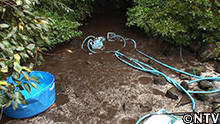電動式水中ポンプで一気に水を吸い出す。