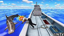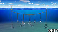 尻尾と針の掛かった口、2点でサメの動きを封じて船に縛り付ける。 |