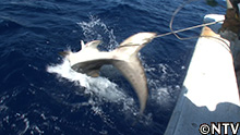 この強い引きは、強力なアゴと強い力が特徴のオオテンジクザメ。