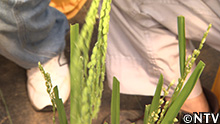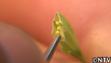 新男米のめしべに別の品種の花粉を交配して新しい米を作る。 |