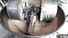 回転する巨大な臼状の粉砕機で、さらに粉々に。