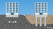 硬い地盤の上なら、直接建物を建てられるが、軟らかい地盤は、