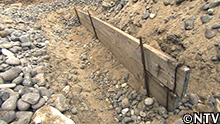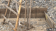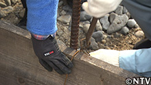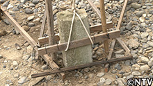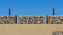 地面に鉄筋を打ちこみ、板を固定すれば石が留まり、崩れない。