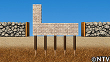 杭が届いていないと、建物が沈み傾いてしまう。 |