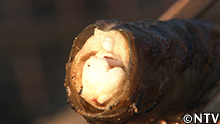 削っては、天日で干すを繰り返し、ヌタウナギの燻製作りは、最後の行程に。 |