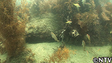 港跡の入口は砂の海底で、岩がごろごろと、小魚たちも多い。