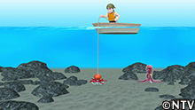 達也は腕を上下左右に動かし、タコを誘い出す。