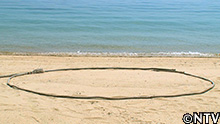 浜に漂着物のロープで、その勝負を決する土俵を描く。 |