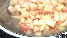 そこに、桃を投入し、弱火で潰しながら5分煮込めば、