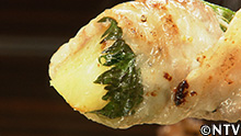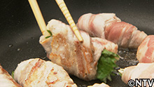 櫛切りの桃を大葉と豚バラで巻き、フライパンで焼く。