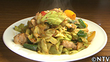 三品目は、生姜、ネギ、色どりにピーマンとパプリカ、キャベツをゴマ油で炒め、