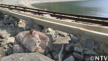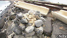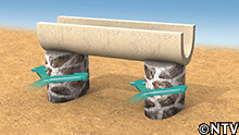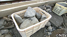 50㎏の樋を持ち上げるほどの波の力に負けぬよう、重い石をいっぱいに詰める。